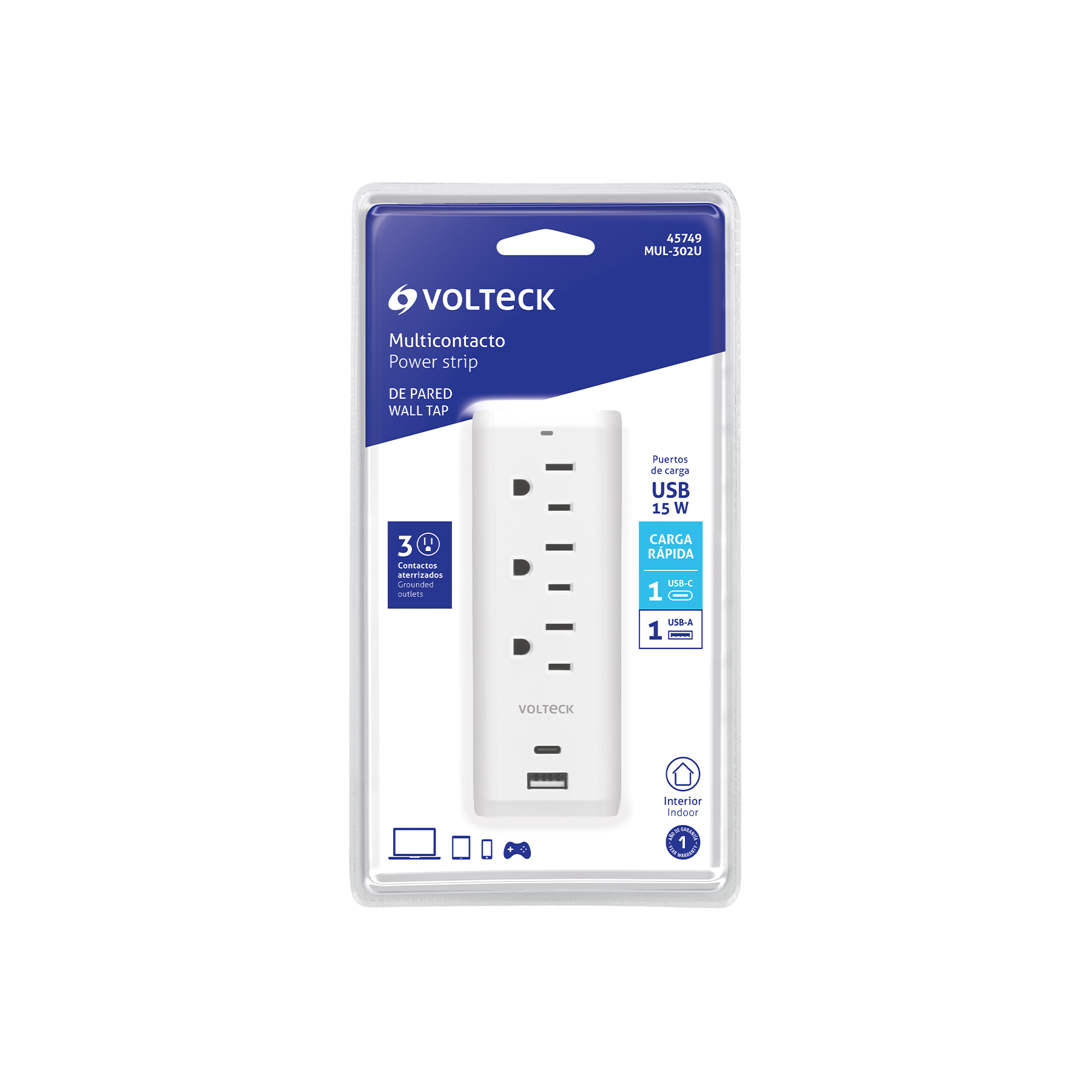 Multicontacto de pared, 3 contactos y 2 USB A+C, VOLTECK