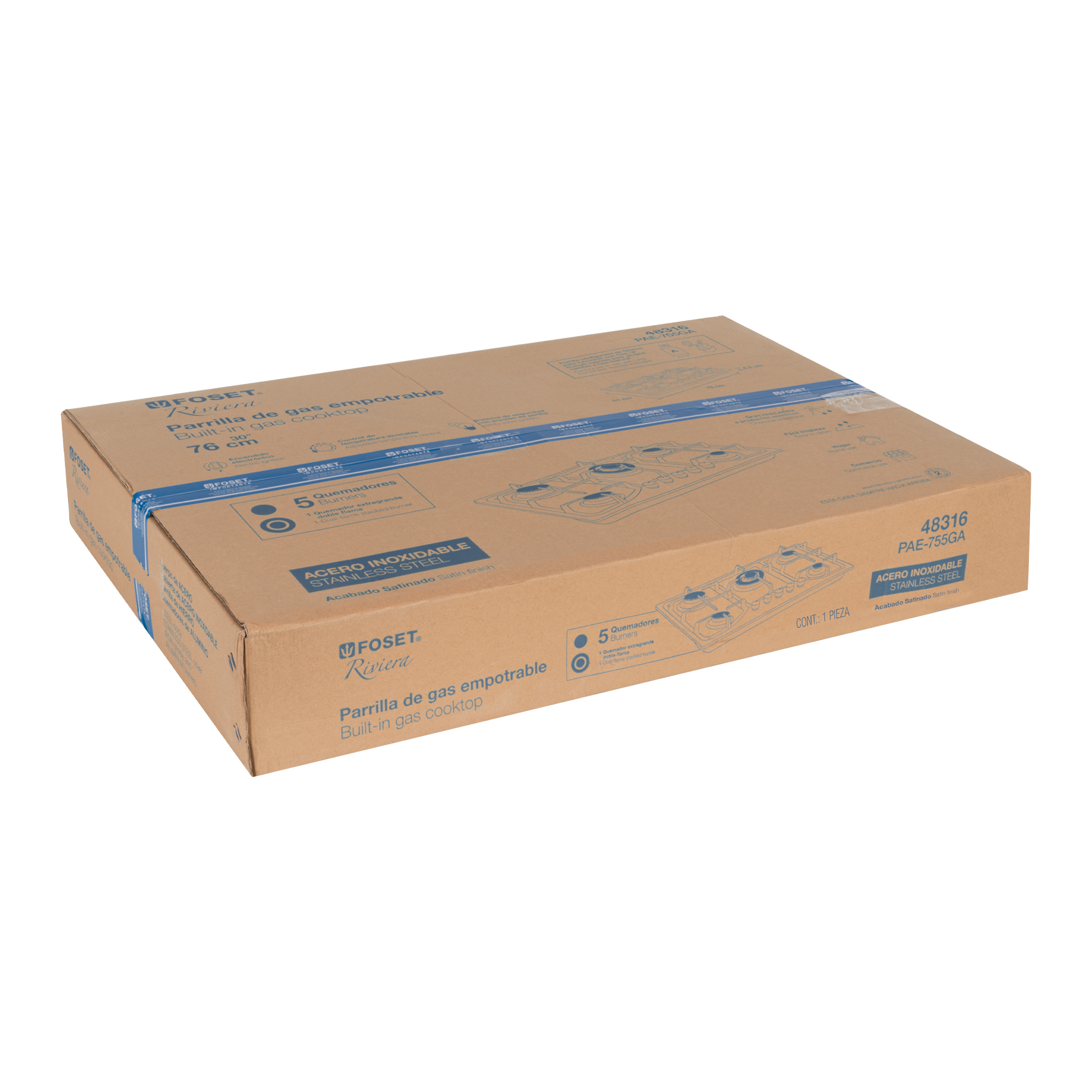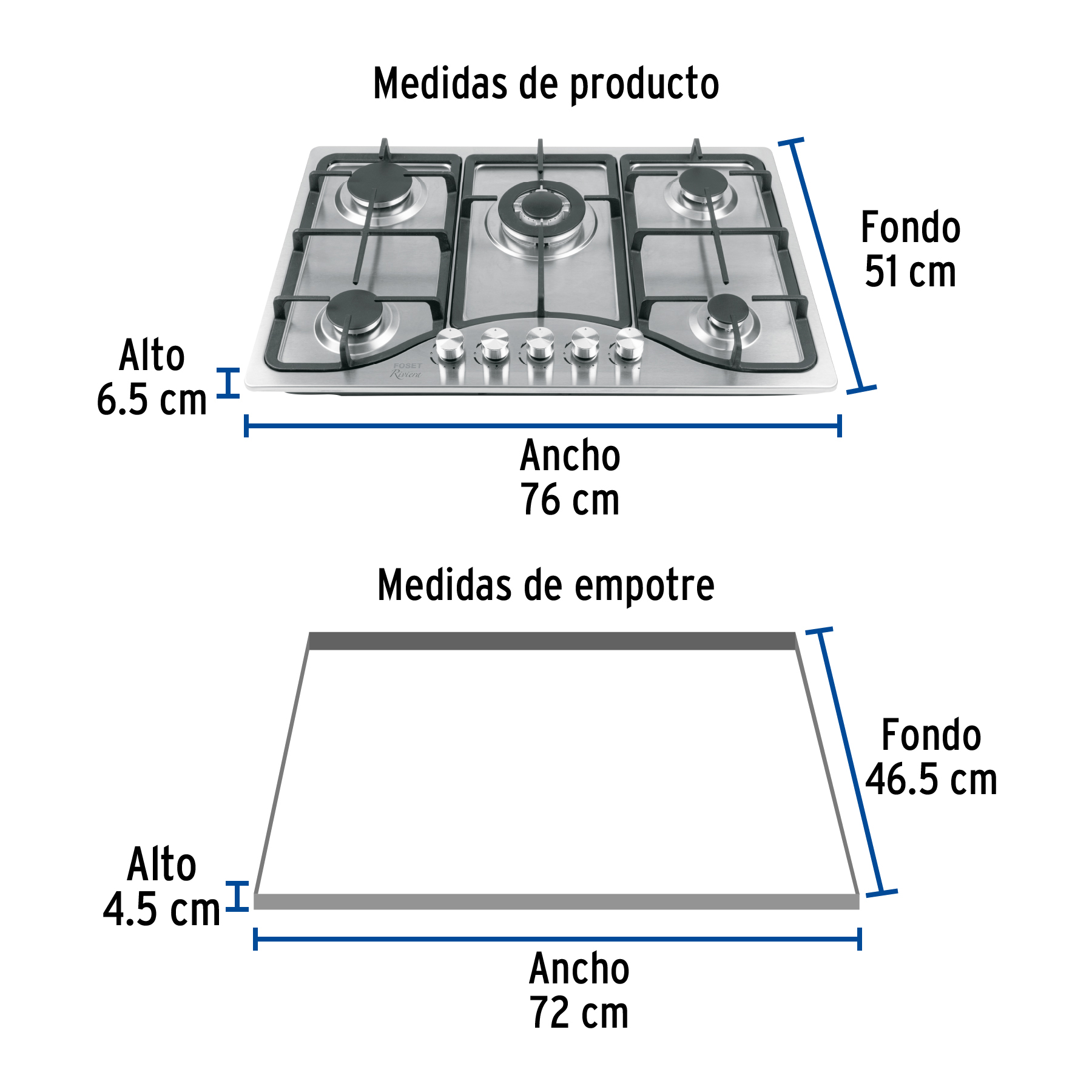 Parrilla gas empotrable 75cm, 5 quem, acero inox, Riviera