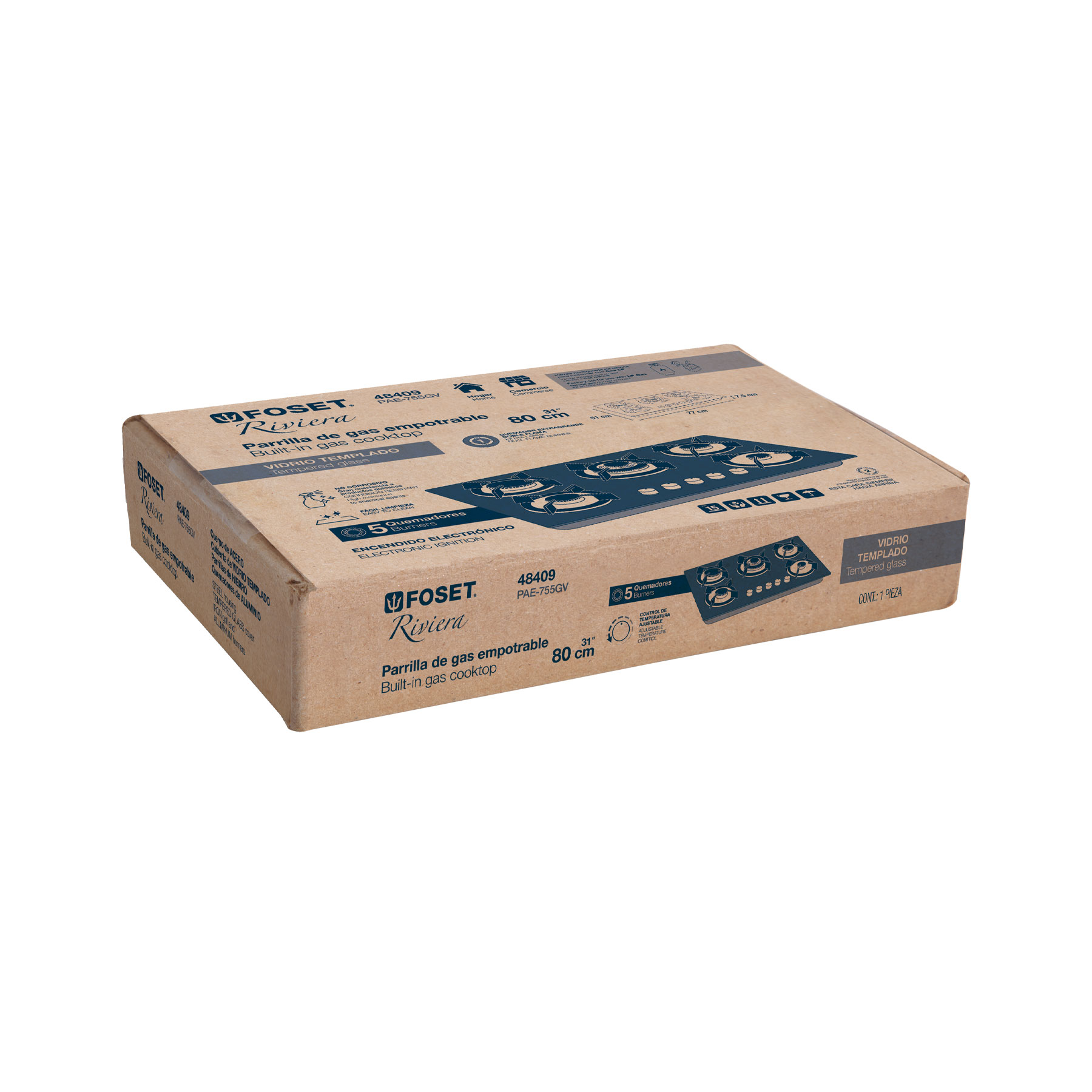 Parrilla gas empotrable 75cm, 5 quem, vidrio negro, Riviera