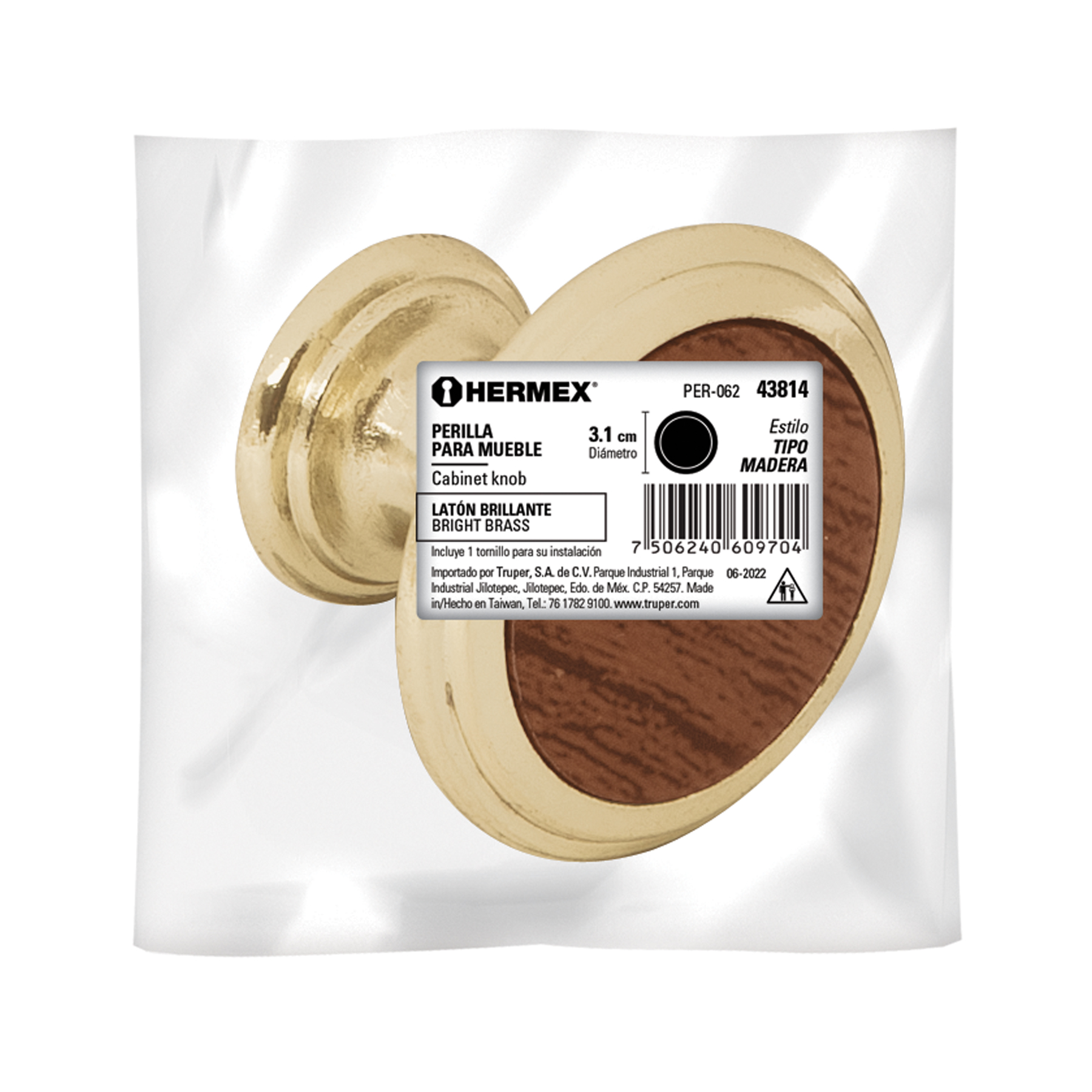 Sé el primero en valorar “Perilla metálica, latón brillante, inserto madera, HERMEX”