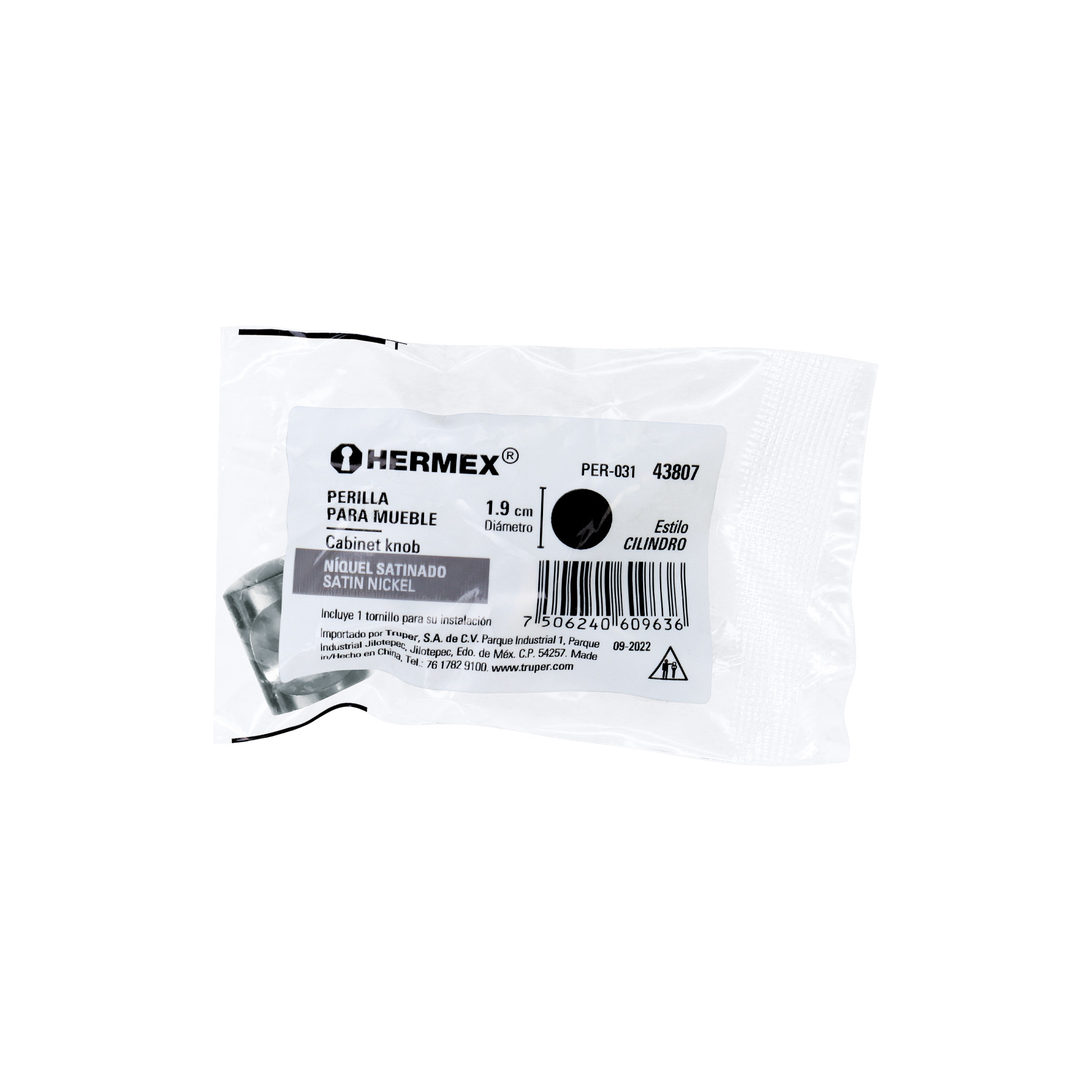 Perilla metálica estilo ‘Cilindro’, níquel satinado, HERMEX