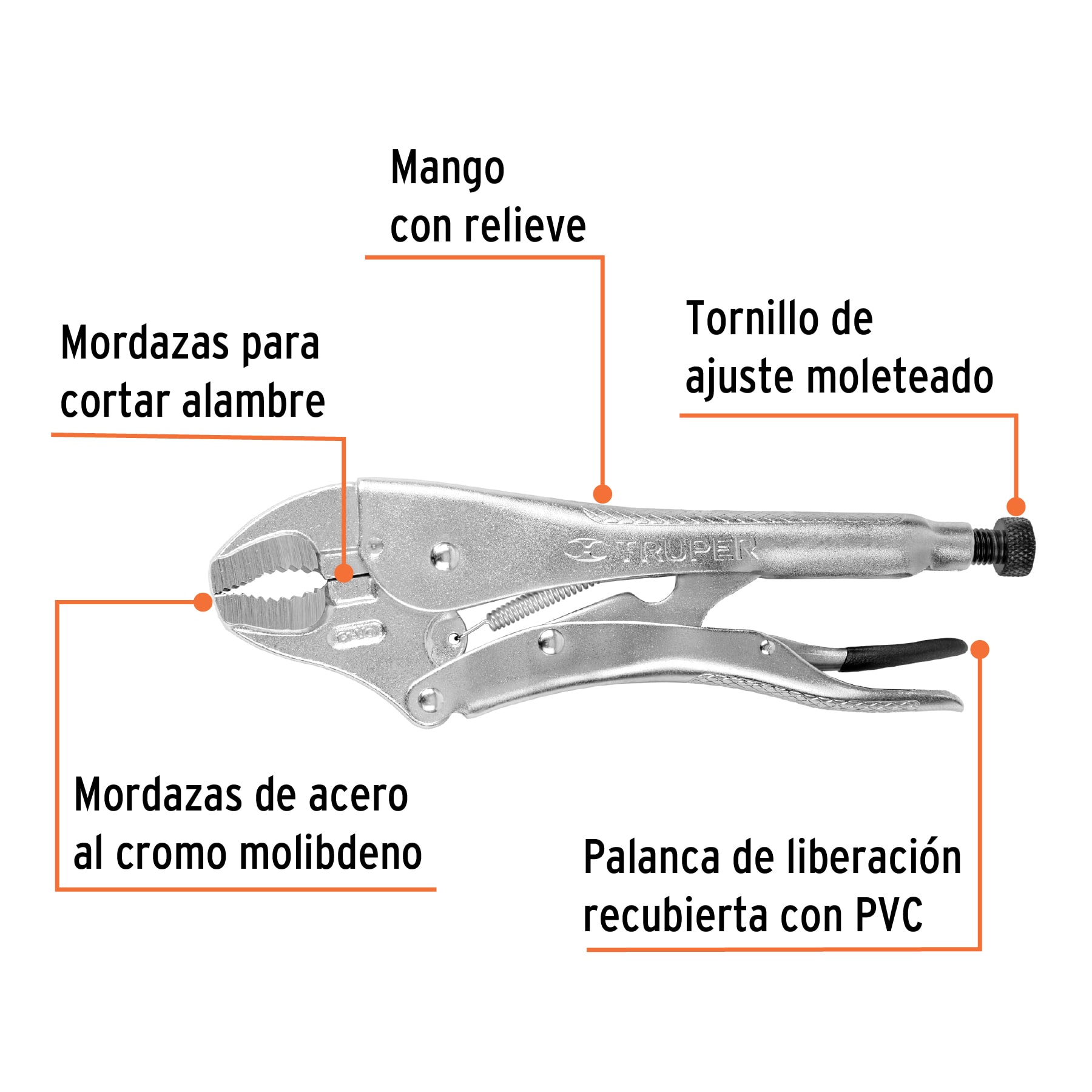 Mangos con textura antiderrapante. Palanca de liberación recubierta de vinil para destrabar las pinzas. Con estriado diagonal en sus mordazas para agarre firme y seguro.