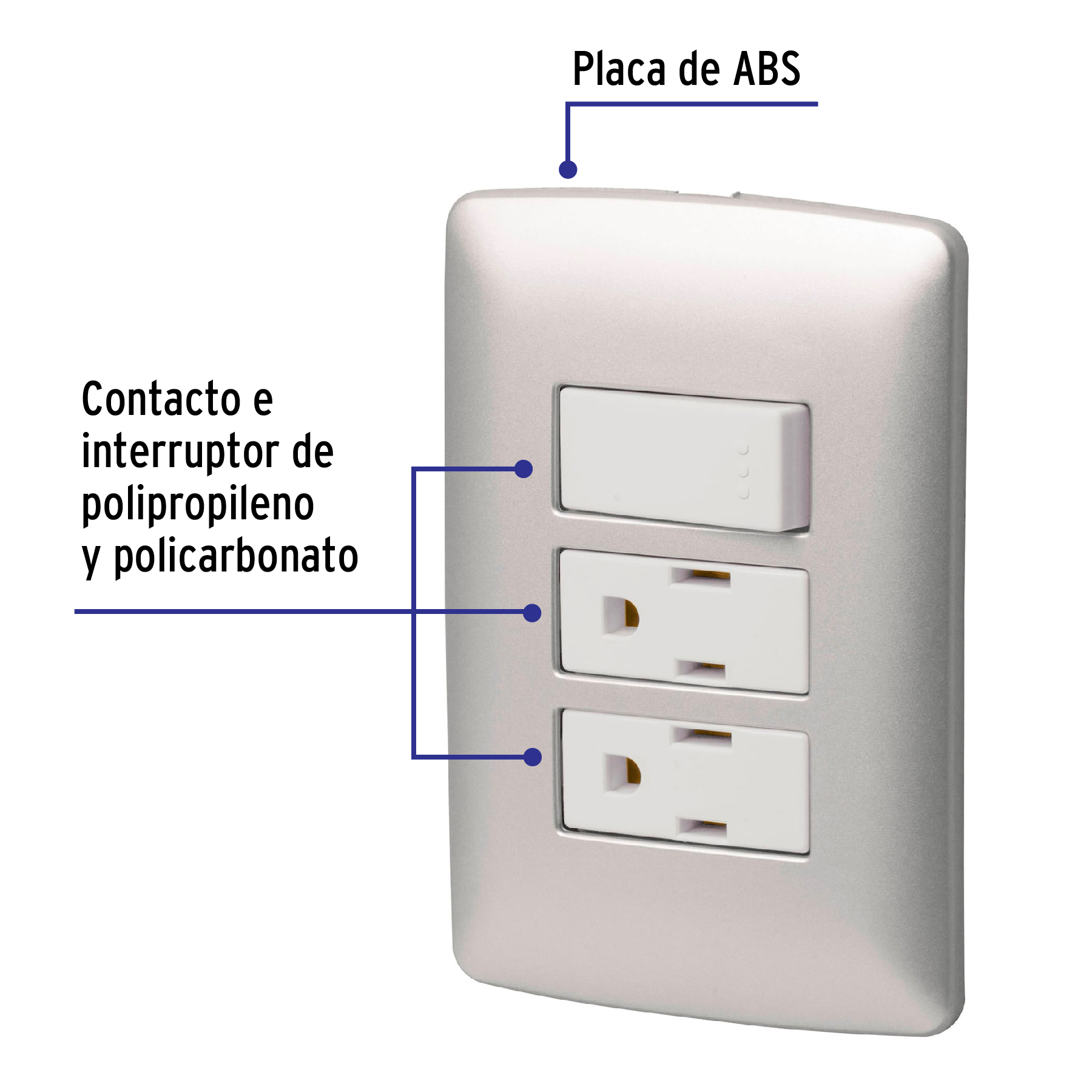 Placa armada 2 contactos e interruptor,plata, línea Italiana