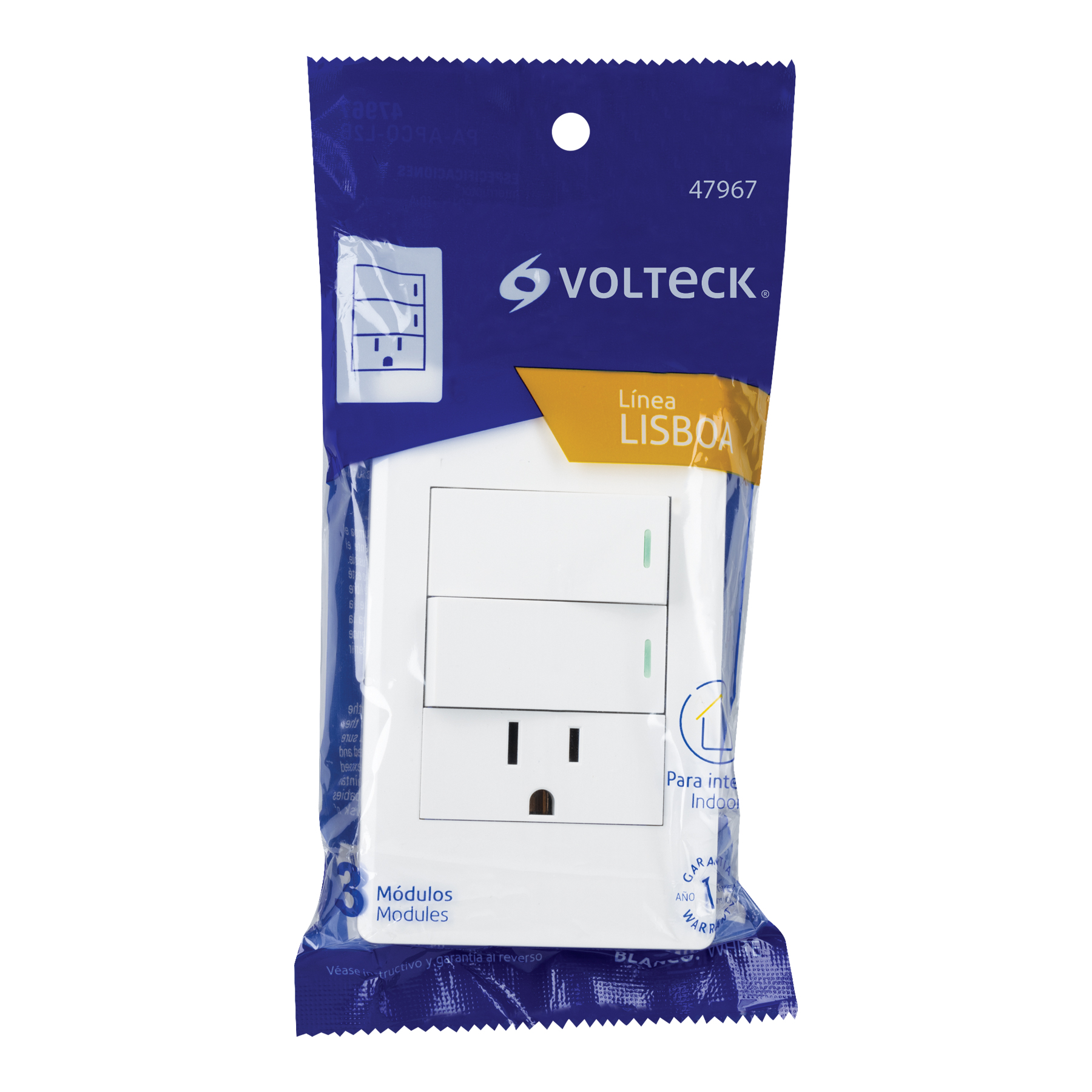 Placa armada blanca 2 interruptores y contacto 1 mód,Lisboa