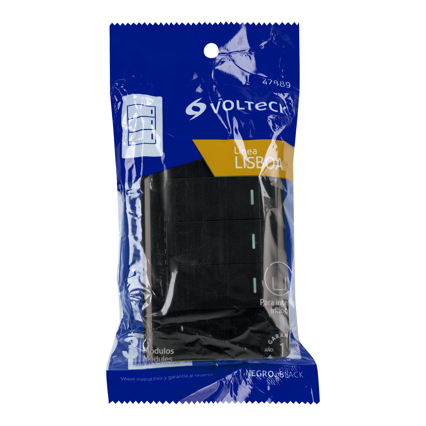 Placa armada negra 3 interruptores 1 módulo, Lisboa, Volteck