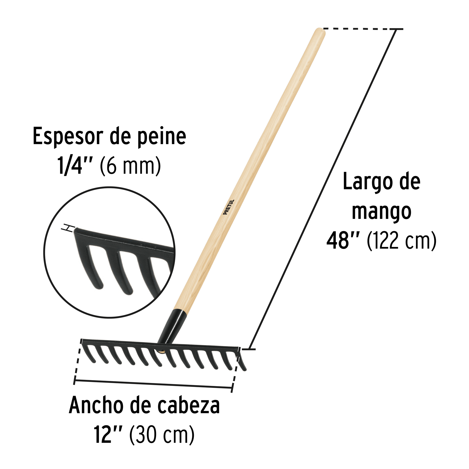 Rastrillo recto de 12 dientes, mango de 48′, Pretul