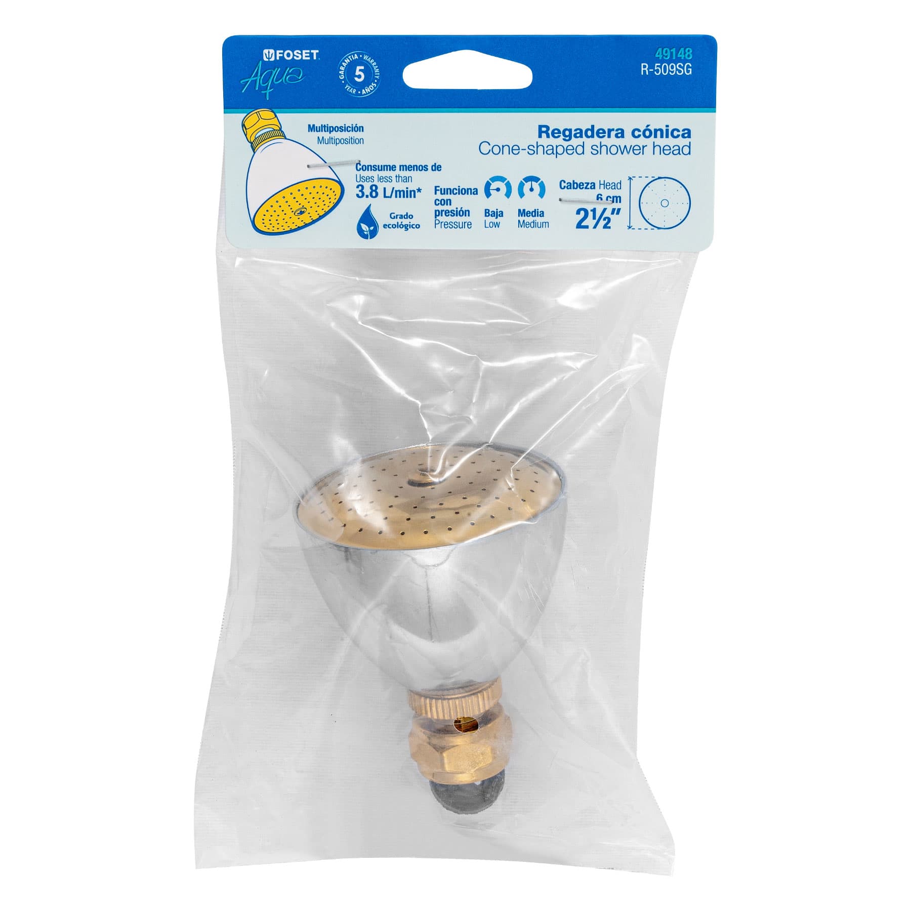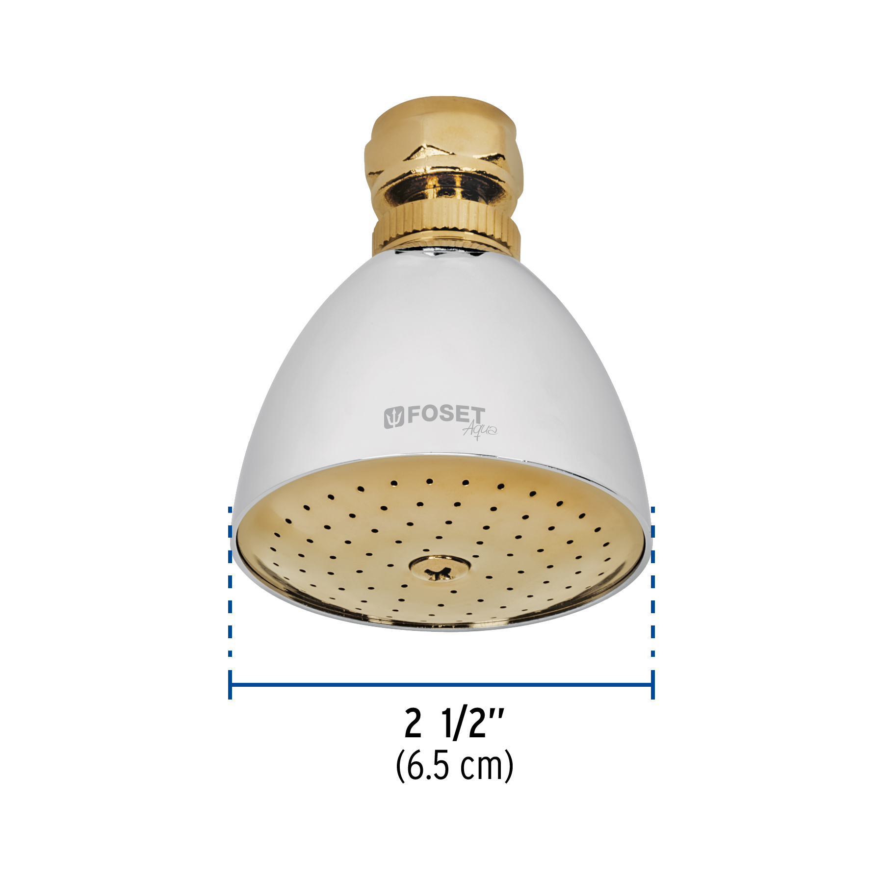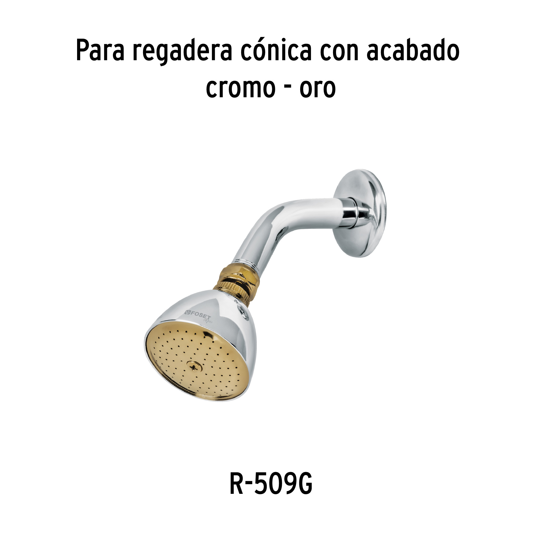 Regadera cónica 2-1/2′, metálica, sin brazo, cromo-oro, AQUA