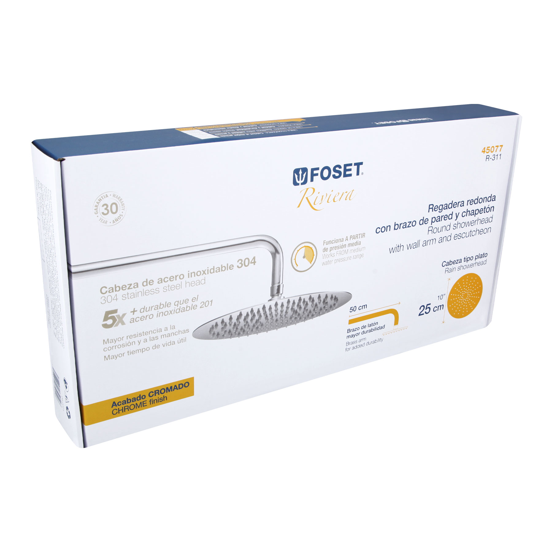 Regadera plato redondo 10′ con brazo, cromo, FOSET RIVIERA