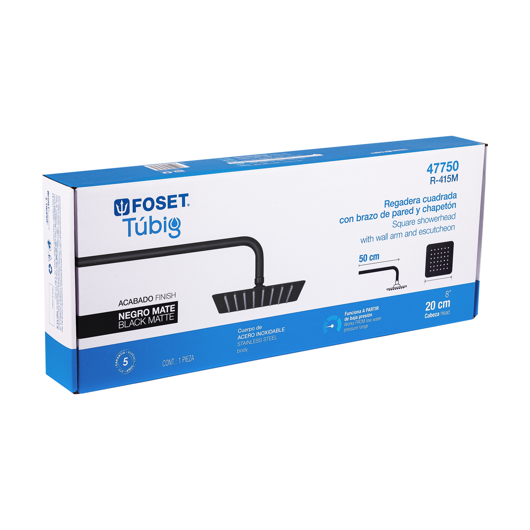 Regadera cuadrada 8′, acero inox, con brazo, negro, Túbig