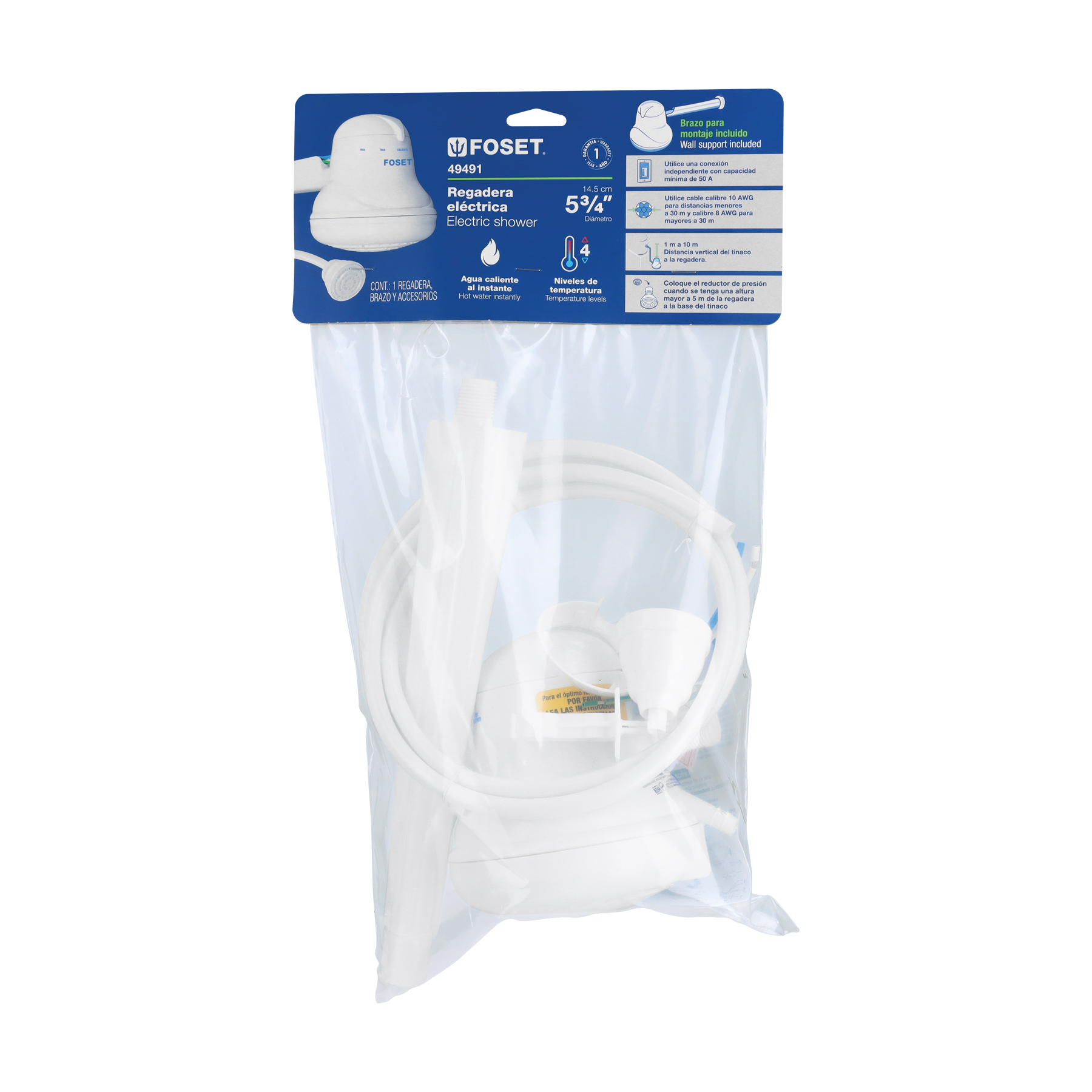 Regadera eléctrica, 4 temperaturas, 14.5cm, blanca, Foset