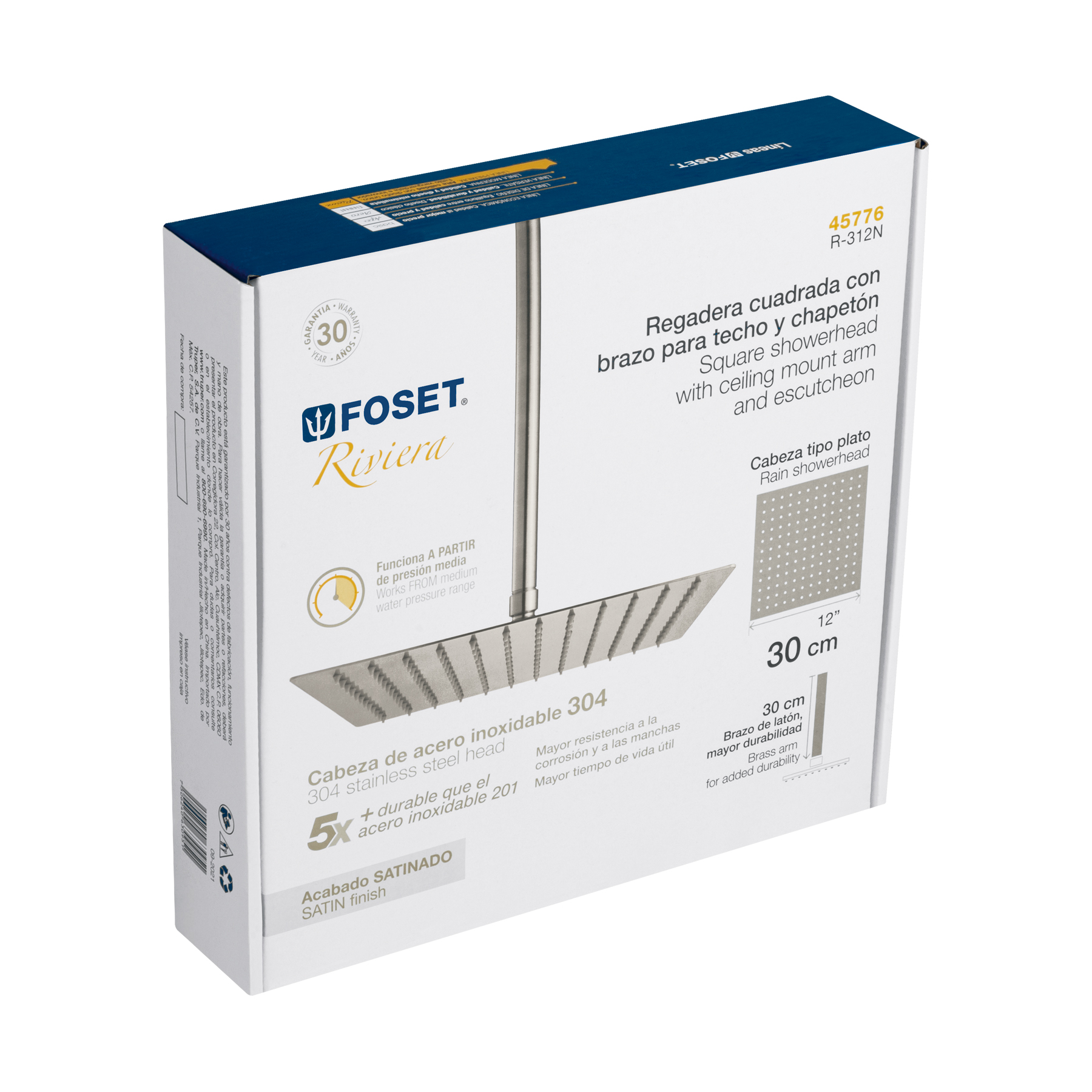 Regadera plato cuadrado 12′ con brazo, satín, FOSET RIVIERA