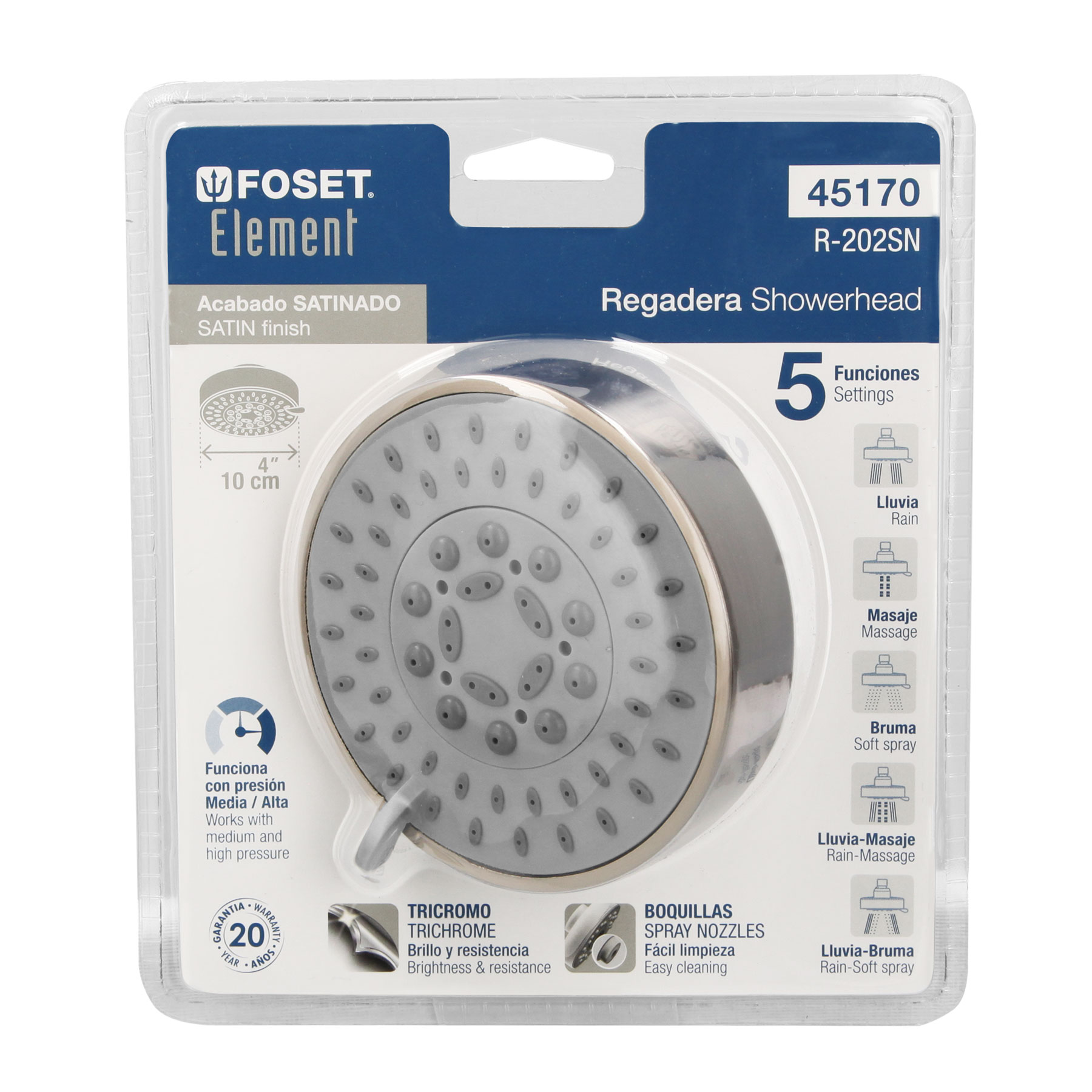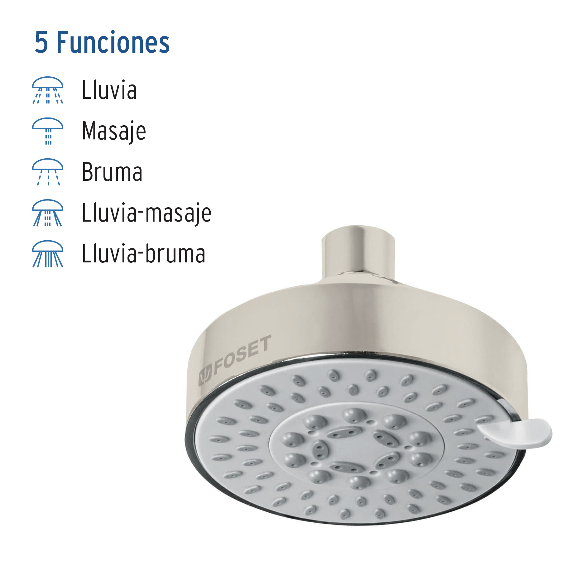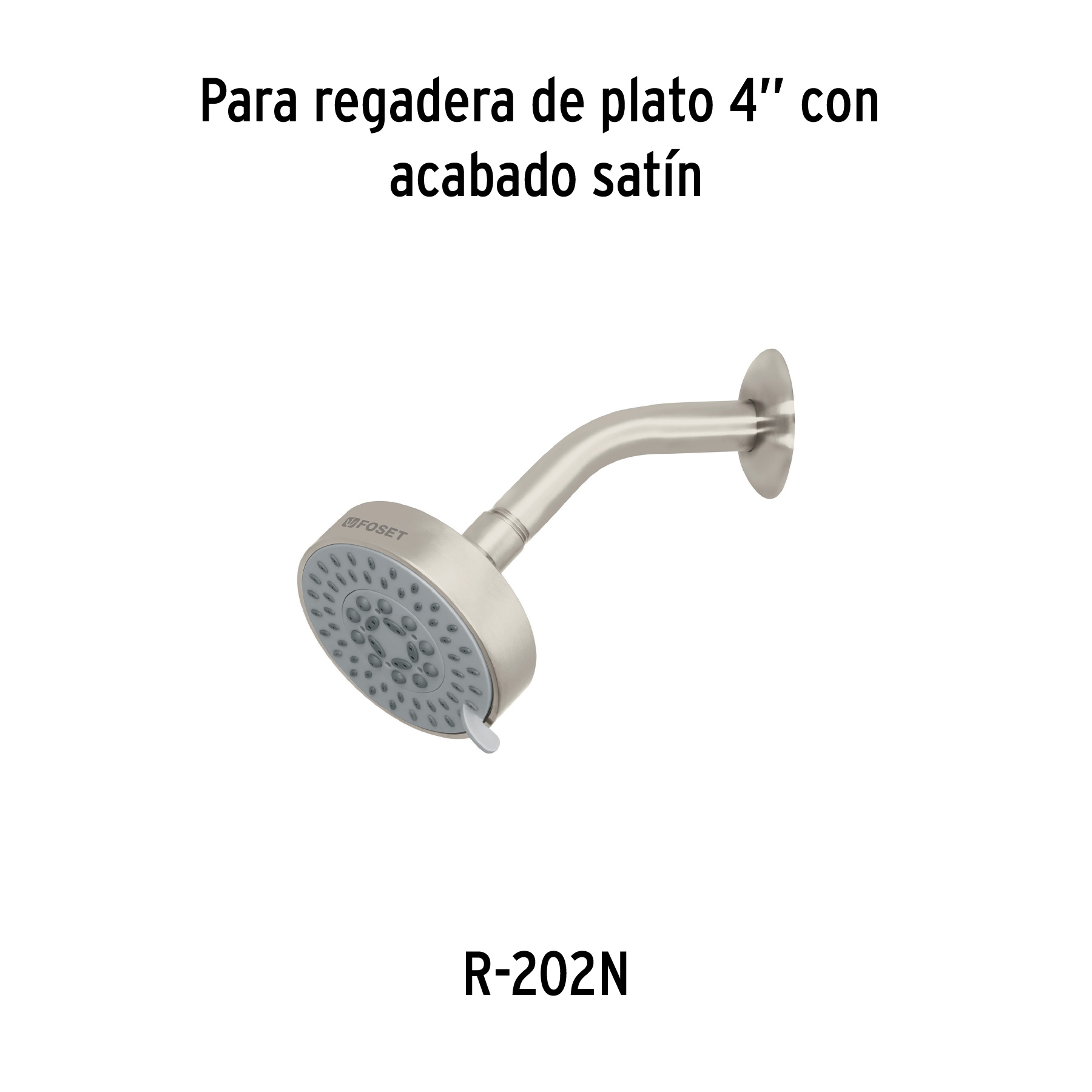 Regadera satín 4’con 5 funciones, sin brazo, Foset Element
