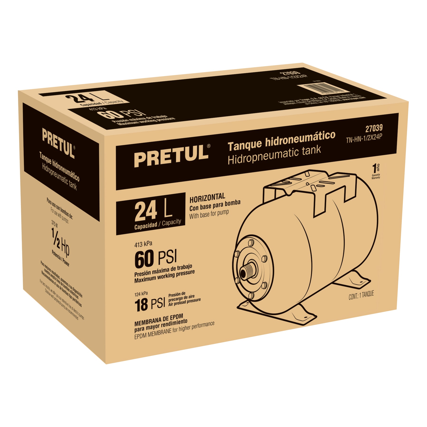 Tanque hidroneumático horizontal, 24 litros, PRETUL